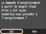 Vous pouvez également enregistrer l'appareil depuis un terminal mobile ou Google Chrome. L'écran de l'appareil affiche l'écran de confirmation ci-après avant la fin de l'enregistrement. Appuyez sur <Oui> pour terminer l'enregistrement.