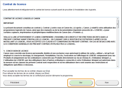 Lisez attentivement le contrat de licence et cliquez sur [Oui] pour l'accepter.