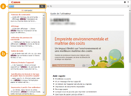 Affiche les résultats de la recherche associés aux pages contenant les mots clés que vous avez stipulés. Dans la liste des résultats, identifiez la page que vous recherchez et cliquez sur le titre de rubrique de la page en question.