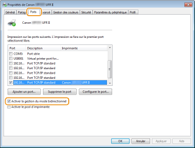 Dans l'onglet [Ports], assurez-vous que la case [Activer la gestion du mode bidirectionnel] est cochée.