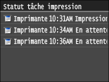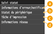 , un écran s'affiche. Ce dernier permet d'examiner l'état du document en cours d'impression ainsi que l'état de l'appareil (niveaux de toner, etc.) ou informations sur les réglages réseau comme l'adresse IP de l'appareil.