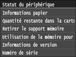 Affiche l'état de l'appareil, tel que la quantité de papier ou d'encre encore disponible dans la cartouche de toner.
