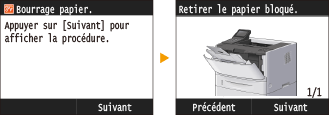 Dans certains cas, lorsqu'une erreur se produit, les instructions permettant d'y remédier s'affichent. Suivez ces instructions pour corriger l'erreur. L'écran apparaissant en cas de bourrage papier est reproduit ci-après à titre d'exemple.