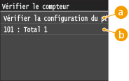 ), l'écran <Vérifier le compteur> s'affiche. A partir de cet écran, vous pouvez afficher la valeur du compteur d'impressions, ainsi que le numéro de série de la machine et la configuration de la machine.