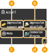 L'écran <Accueil> ou l'écran des paramètres s'affiche, ce qui vous permet de d'exécuter des fonctions telles que l'impression USB ou l'impression sécurisée. Vous pouvez également utiliser l'écran pour consulter des informations telles que des messages d'erreur et l'état de fonctionnement de l'appareil. L'écran est également tactile, ce qui vous permet d'effectuer des opérations en le touchant directement.