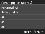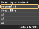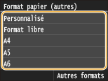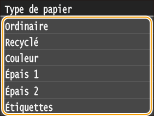 Si l'écran illustré ci-dessus ne s'affiche pas lorsque le papier est chargéSi vous chargez toujours le même papier dans le bac multifonctions, vous pouvez ignorer les opérations de configuration du papier en définissant par défaut le format et le type de papier. Notez que si un paramètre par défaut est enregistré, l'écran illustré ci-dessus ne s'affiche pas. Pour afficher l'écran, sélectionnez <Spécifier lors du chargement du papier> (Enregistrement des paramètres papier par défaut du bac multifonctions).