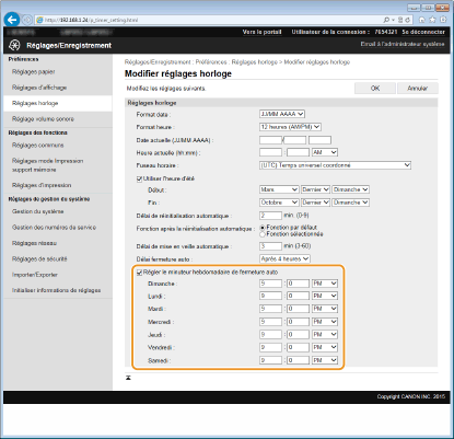 Cochez la case [Régler le minuteur hebdomadaire de fermeture auto], puis définissez l'heure de mise hors tension.