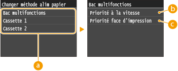 Papier), <Priorité à la vitesse> est alors appliqué à la source de papier. Dans ce cas, vous devez charger le papier comme vous le faites lorsque vous choisissez le réglage <Priorité à la vitesse> (