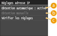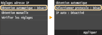 ![]() Si <Activé> s'affiche, appuyez sur <Obtention automatique> et définissez <Sélection du protocole> et <IP auto> sur <Désactivé>.