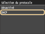Appuyez sur <Désactivé>. Si vous appuyez sur <DHCP>, alors que ces services ne sont pas disponibles, l'appareil consacre inutilement du temps et des ressources de communications à rechercher le réseau pour ces services.
