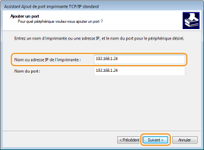 Saisissez l'adresse IP ou le nom DNS de l'appareil, puis cliquez sur [Suivant].