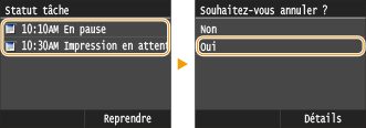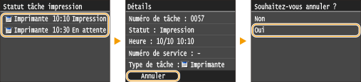 Annulation à partir de l'IU distanteVous pouvez annuler l'impression dans la page [Statut tâche] de l'interface utilisateur distante : Vérification de l'état actuel des documents d'impression