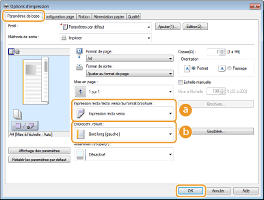 Sélectionnez [Impression recto] ou [Impression recto verso] dans [Impression recto/recto verso/au format brochure ]