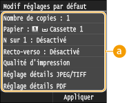 Les réglages par défaut désignent les réglages qui s'affichent lorsque vous allumez l'appareil ou appuyez sur