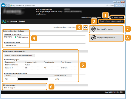 Affiche l'état actuel de l'appareil et les informations d'erreur. En cas d'erreur, le lien vers la page Informations d'erreur apparaît.