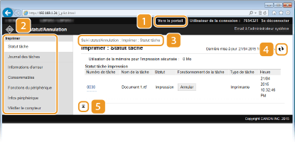 Affiche la page [Suivi statut/Annulation]. Vous pouvez utiliser cette page pour vérifier l'état actuel de l'impression, annuler le traitement de l'impression et consulter l'historique des tâches d'impression.