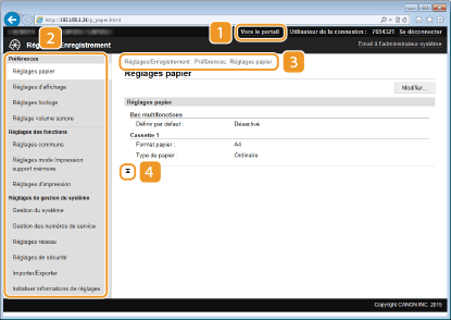 Affiche la page [Réglages/Enregistrement]. Lorsque vous êtes connecté en tant qu'administrateur système, vous pouvez modifier les valeurs des réglages et enregistrer/charger les données mémorisées.