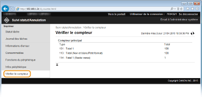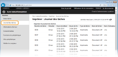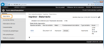 Cliquez sur [Numéro de tâche] pour les documents dont l'impression est suspendue et les documents sécurisés pour afficher leurs informations détaillées. Vous pouvez vérifier le nom de l'utilisateur et le nombre de pages sur le document imprimé.