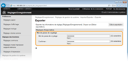 Saisissez un mot de passe de cryptage de 32 caractères alphanumériques au maximum. Saisissez le même mot de passe dans [Confirmer]. Pour exporter les données, vous devez configurer un mot de passe de cryptage.