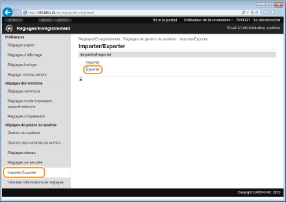 Vous pouvez exporter les données de paramétrage de l'appareil, puis les enregistrer sur votre ordinateur. Il est recommandé de sauvegarder régulièrement les paramètres importants.