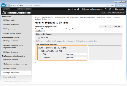 Cochez la case [Utiliser le PIN d'accès à l'IU distante], puis définissez le code PIN.