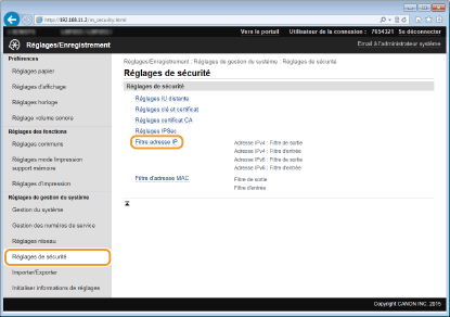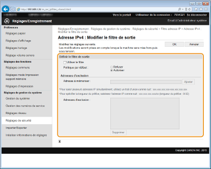 En cas de saisie incorrecte des adresses IP, vous risquez de ne pas pouvoir accéder à l'appareil via l'interface utilisateur distante. Si cela devait se produire, il faudrait définir <Filtre d'adresse IPv4> ou <Filtre d'adresse IPv6> sur <Désactivé>. Filtre d'adresse IPv4 Filtre d'adresse IPv6
