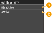 Le protocole HTTP permet d'établir une liaison réseau (lors de l'accès à l'appareil via l'interface utilisateur distante, par exemple). Si vous utilisez une connexion USB ou n'avez pas besoin d'établir une communication HTTP, vous pouvez désactiver le mode HTTP pour bloquer les intrusions de tierces parties via le port HTTP inutilisé.
