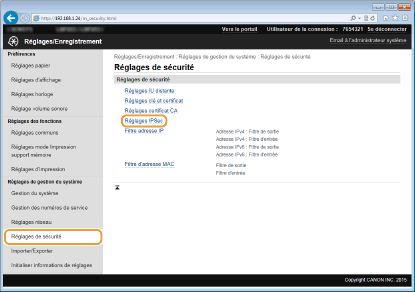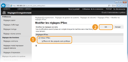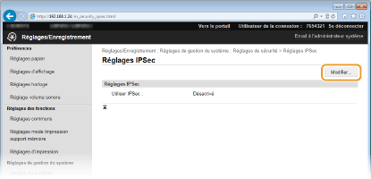 Utilisation du panneau de commandeVous pouvez également activer ou désactiver la communication IPSec à partir de <Menu>, dans l'écran Accueil. Utiliser IPSec