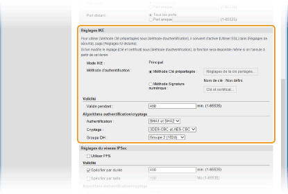 Spécifiez les réglages [Valide pendant] et [Authentification]/[Cryptage]/[Groupe DH]