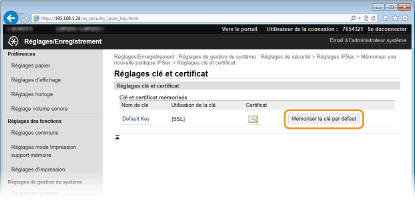 Cliquez sur [Mémoriser la clé par défaut] à droite de la paire de clés à utiliser.