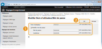 [Modifier mot de passe] Pour définir ou modifier le mot de passe, cochez cette case et saisissez un mot de passe composé de 24 caractères alphanumériques maximum dans les zones de texte [Mot de passe] et [Confirmer].