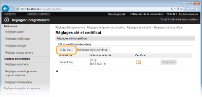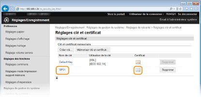 Il est impossible de supprimer une paire de clés en cours d'utilisation, comme lorsque "TLS" ou "IEEE 802.1X" s'affiche sous [Utilisation de la clé]. Dans un tel cas, désactivez la fonction ou remplacez la paire de clés avant de la supprimer.