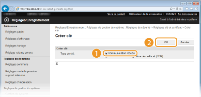 Il est possible de générer une paire de clés sur l'appareil lorsqu'elle est nécessaire à une communication cryptée en TLS (Transport Layer Security). Vous pouvez utiliser le cryptage TLS lorsque vous accédez à l'appareil au moyen de l'interface utilisateur distante. Vous pouvez enregistrer jusqu'à cinq paires de clés sur l'appareil, en comptant les paires pré-installées. Les certificats auto-signés sont utilisés avec les paires de clés générées dans "Communication réseau". Avec une "Clé et demande de signature de certificat (CSR)", vous pouvez demander un certificat numérique émis par une autorité de certification pour la paire de clés générées par l'appareil.