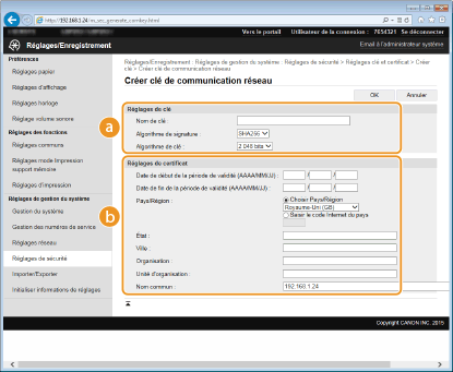 Spécifiez les réglages de la clé et du certificat.