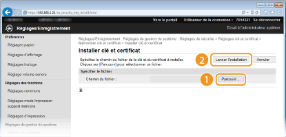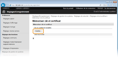 Cliquez sur [Réglages clé et certificat] pour installer une paire de clés, ou sur [Réglages certificat CA] pour installer un certificat CA.