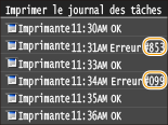Si l'impression échoue à cause d'une erreur, l'écran de journal d'impression affiche un code d'erreur de trois chiffres. Vérifiez les éléments suivants pour déterminer les causes et les solutions pour chaque code d'erreur.