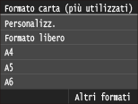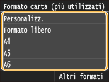 Se non viene visualizzata la schermata precedente quando si carica la cartaSe si carica sempre la stessa carta vassoio multiuso, è possibile ignorare le operazioni di impostazione carta registrando formato e tipo di carta come impostazioni predefinite. Quando si registra l'impostazione predefinita, tuttavia, la schermata illustrata sopra non viene visualizzata. Per visualizzare la schermata, selezionare <Specificare al caricamento carta> (Registrazione delle impostazioni predefinite per la carta per il vassoio multiuso).