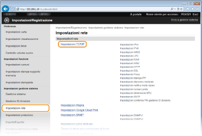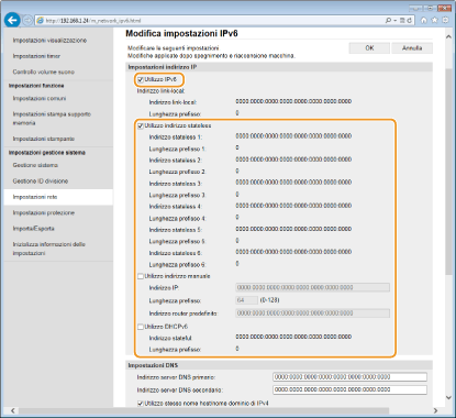 Gli indirizzi IPv6 della macchina possono essere configurati attraverso una IU remota. Prima di impostare gli indirizzi IPv6, verificare le impostazioni dell'indirizzo IPv4 (Visualizzazione delle impostazioni IPv4). È necessario impostare correttamente i parametri IPv4 per utilizzare gli indirizzi IPv6. La macchina può usare fino a nove dei seguenti indirizzi IPv6: