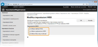 Selezionare la casella di controllo per ottenere informazioni sulla macchina da un computer tramite WSD. La casella di controllo viene selezionata automaticamente quando la casella di controllo [Utilizzo stampa WSD] è selezionata. [Utilizzo Discovery multicast]