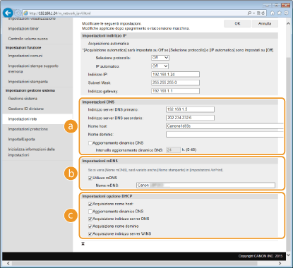 Selezionare la casella di controllo per aggiornare dinamicamente i record DNS qualora cambi l'indirizzo IP della macchina. Quando si specifica l'intervallo tra gli aggiornamenti, specificare il tempo in ore nella casella di testo [Intervallo aggiornamento dinamico DNS]. [Impostazioni mDNS][Utilizzo mDNS]