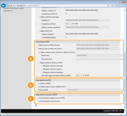 Selezionare la casella di controllo per utilizzare lo stesso nome mDNS di IPv4. Per impostare un nome diverso, deselezionare la casella di controllo e immettere il nome mDNS nella casella di testo [Nome mDNS]. [Impostazioni opzione DHCP][Acquisizione indirizzo server DNS]