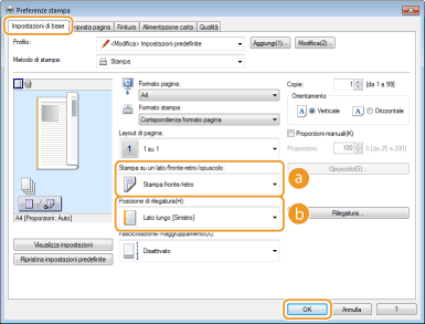 È possibile effettuare stampe su di un lato o fronte-retro. L'impostazione predefinita è [Stampa fronte/retro]. Modificare l'impostazione in base alle esigenze.