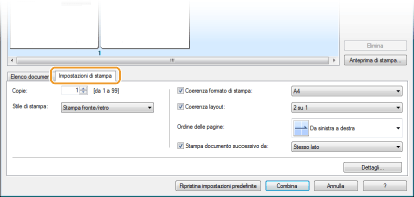 Fare clic sulla scheda [Impostazioni di stampa] per visualizzare la schermata in cui specificare le impostazioni di stampa come numero di copie o stampa su di un lato/fronte-retro. Le impostazioni specificate qui vengono applicate all'intero lavoro di stampa.