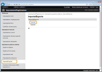 Caricare i dati (importazione) che sono stati esportati dalla macchina. Se i modelli sono gli stessi, è anche possibile importare le impostazioni provenienti da un'altra macchina.