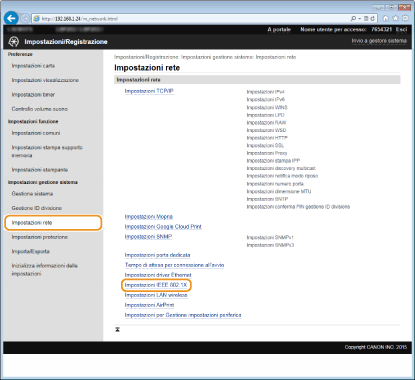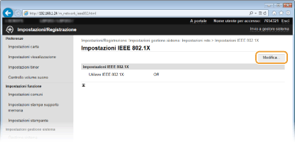 Utilizzo del pannello operativoÈ possibile abilitare o disabilitare l'autenticazione IEEE 802.1X da <Menu> nella schermata <Schermata principale>. Impostazioni IEEE 802.1X
