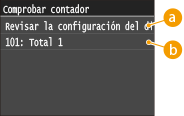 ), se muestra la pantalla <Comprobar contador>.Desde esta pantalla, podrá ver los valores de contadores de las impresiones, así como el número de serie del equipo y la configuración del mismo.