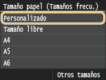 Si la pantalla anterior no aparece cuando hay papel cargadoSi siempre carga el mismo papel en la bandeja multiuso, puede omitir las operaciones de configuración del papel registrando el tamaño y el tipo de papel como opción predeterminada. Sin embargo, si se registra la opción predeterminada, la pantalla anterior no aparecerá. Para visualizar la pantalla, seleccione <Especificar cuando cargue papel> (Registro de las opciones de papel predeterminadas para la bandeja multiuso).
