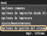 Todas las opciones de gestión del sistema se muestran con descripciones breves. Las opciones predeterminadas aparecen marcadas con una cruz (  ).