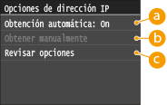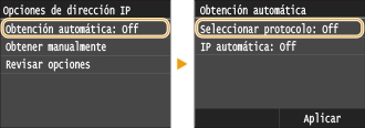 ![]() Si aparece <On>, pulse <Obtención automática> y establezca tanto <Seleccionar protocolo> como <IP automática> en <Off>.