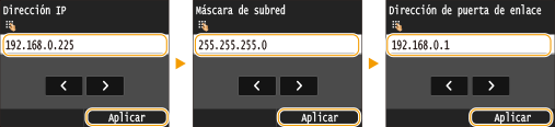 <Máscara de subred> <Dirección de puerta de enlace>.Introduzca cada uno de los valores utilizando las teclas numéricas y pulse <Aplicar>.